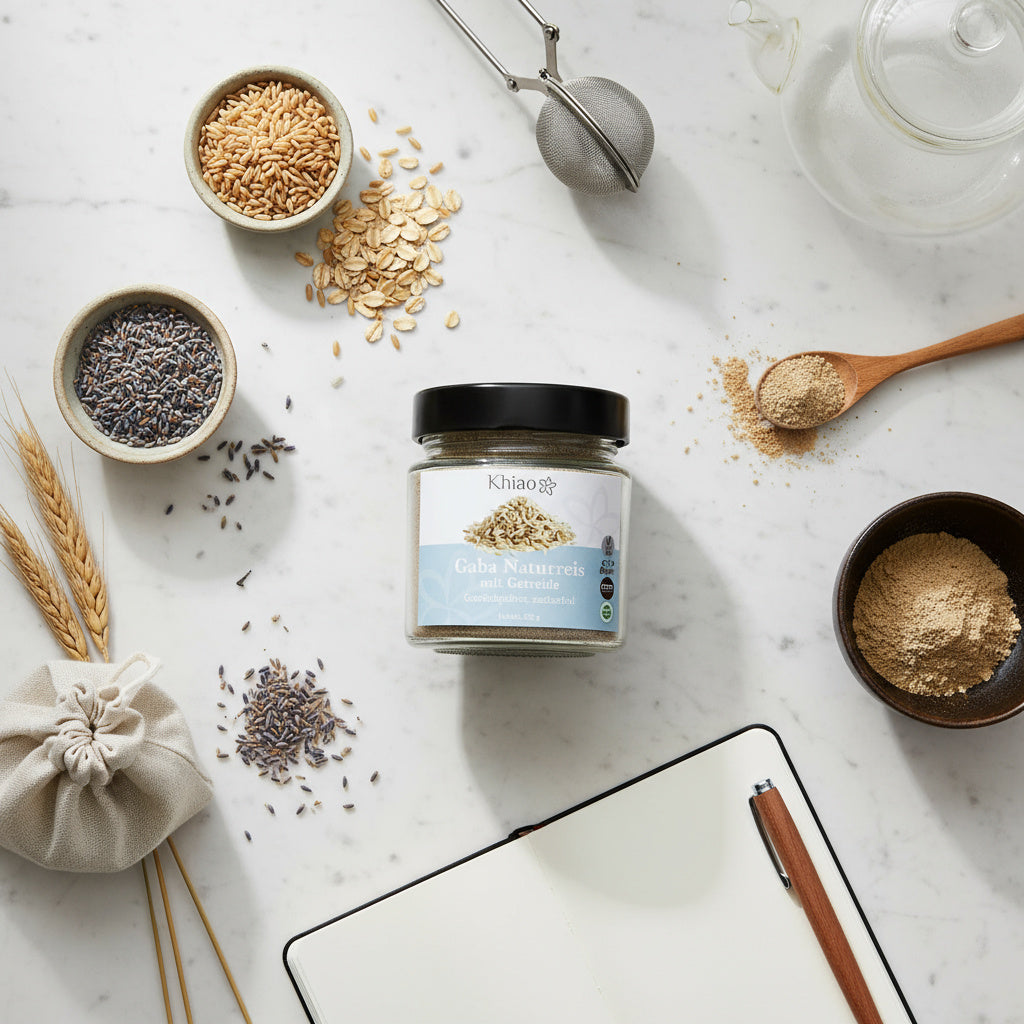 GABA Reis ist 10 x gehaltvoller als gewöhnlicher brauner Reis, Gamma Oryzanol, Anthocyanin, Protein und Aminosäure, Omega 3,6,9 Vitamin C, Vitamin B-Komplex, Vitamin E, Beta-Carotiner, 40-faches Kalzium aus schwarzem Sesam und anderer Pflanzen, Eisen, Zink,